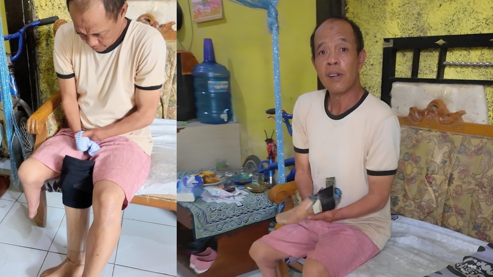 Namun seiring waktu, kaki palsu itu mulai rusak — telapaknya sering copot, dan rasa sakit datang hampir setiap hari saat ia berdiri lama di bawah terik matahari.